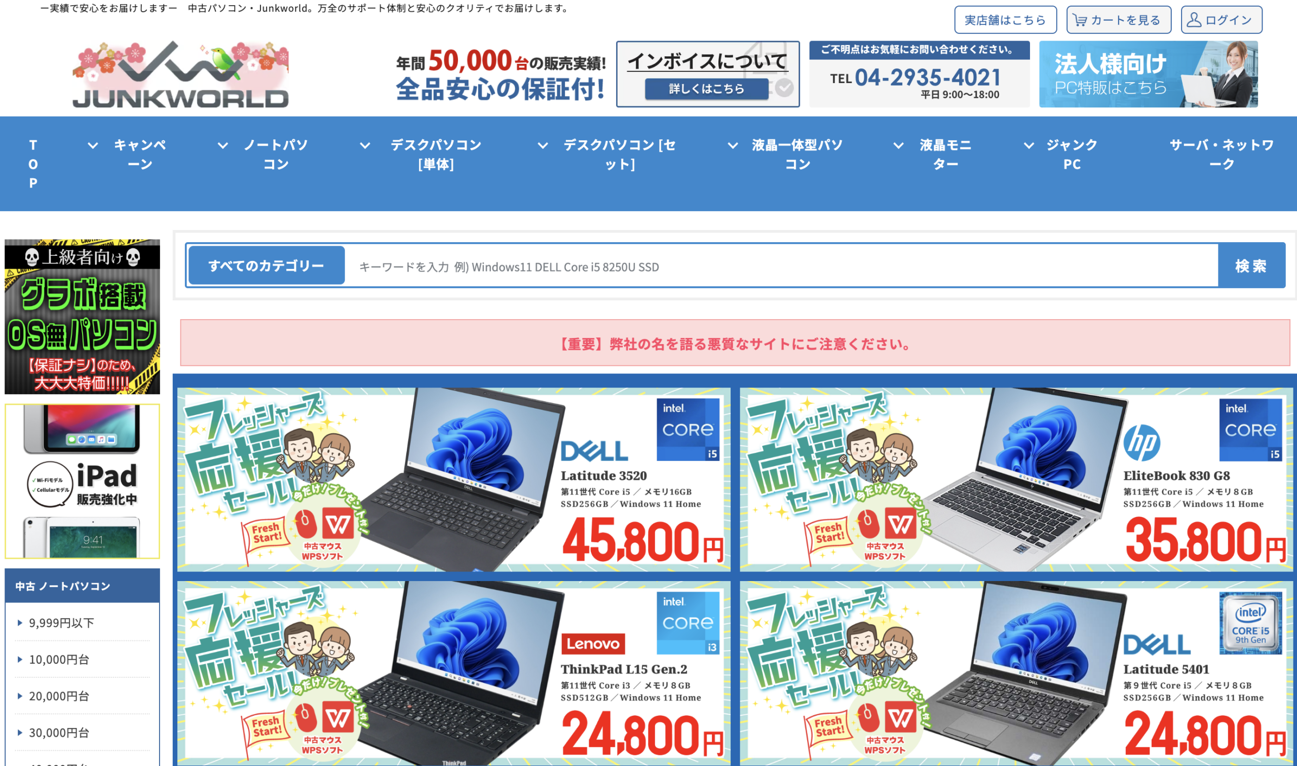 激安中古パソコンショップとして圧倒的な人気を誇るJUNKWORLDは、とにかく「安くて使えるパソコンを手に入れたい」人に最適なサービスです。取り扱い台数が非常に多く、ノートPCからデスクトップまで幅広く揃っており、用途に応じて選びやすいのが特徴です。