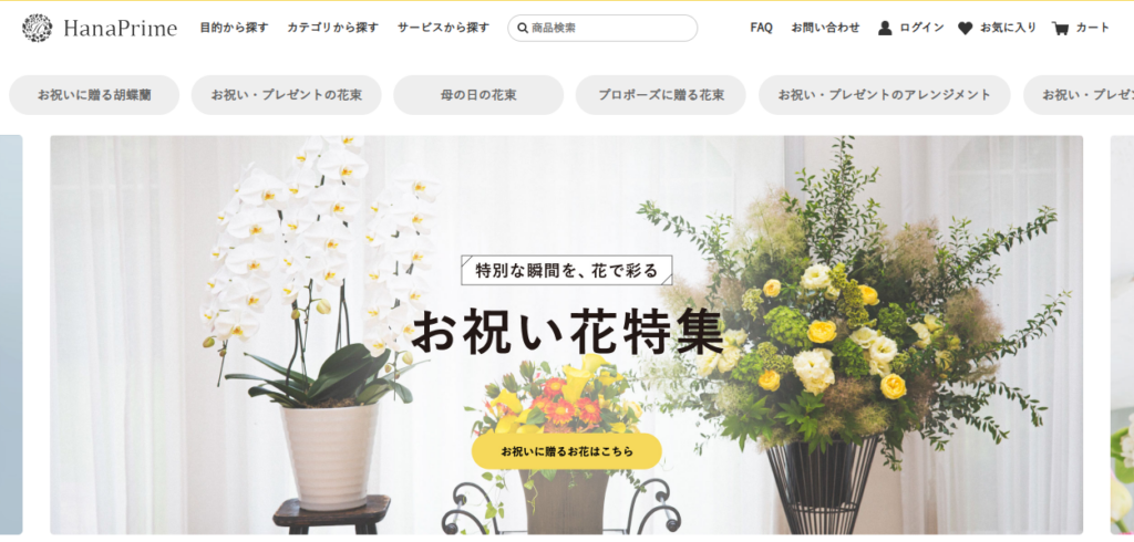 HanaPrimeは、即日配送対応を強みとしたスピード重視型の胡蝶蘭通販サービスです。特に都市部での対応力が高く、最短当日配送が可能なため、急なビジネスギフトにも柔軟に対応できます。