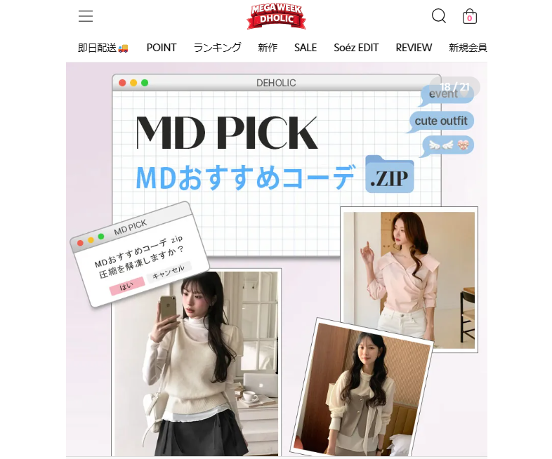 DHOLICは、日本でも比較的知名度のある韓国ファッション通販サイトの一つで、安定した運営体制と使いやすさが特徴です。きれいめなデザインやシンプルなアイテムも多く、大人っぽいコーディネートにも対応しやすい点が魅力とされています。