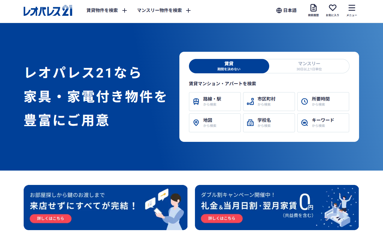 | 2位 | レオパレス21 | 4万円〜 | 物件による | 家具家電付き |