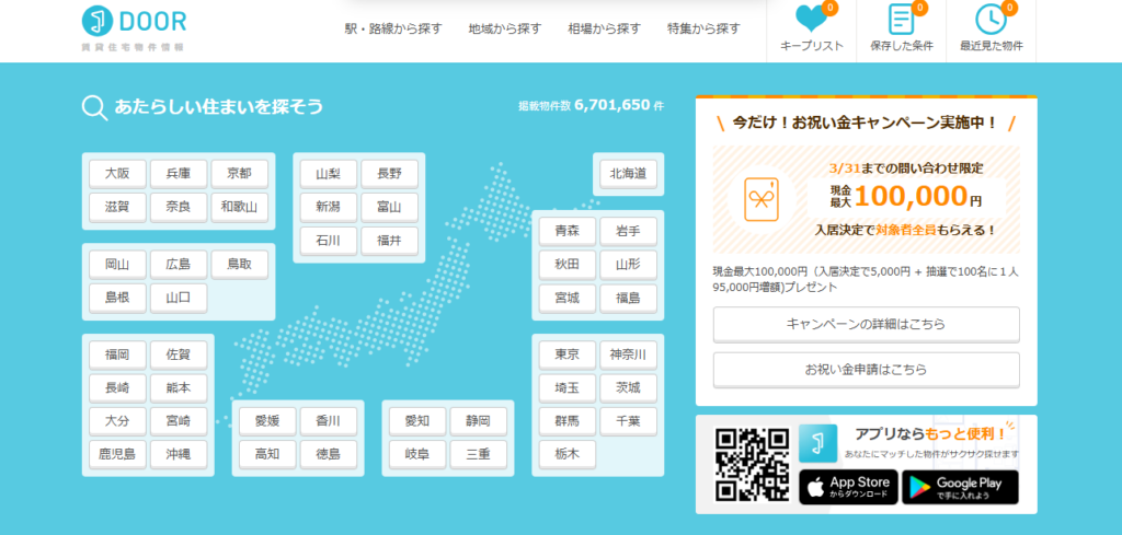 DOOR賃貸は、さまざまな賃貸物件を検索できる不動産情報サイトで、幅広い条件から住まいを探せるサービスです。エリアや家賃、間取りなどの条件を設定して物件を検索できるため、自分の希望に近い部屋を探しやすいのが特徴です。