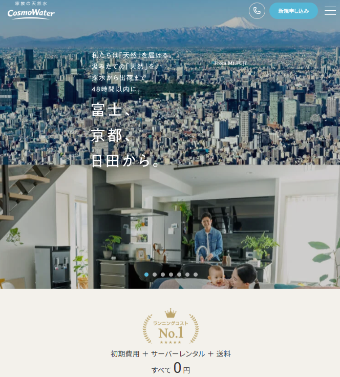 コスモウォーターは、天然水ウォーターサーバーの中でも高い人気を誇るサービスの一つです。採水地から48時間以内に出荷される新鮮な天然水を提供しており、水の品質と鮮度を重視するユーザーから高い評価を得ています。