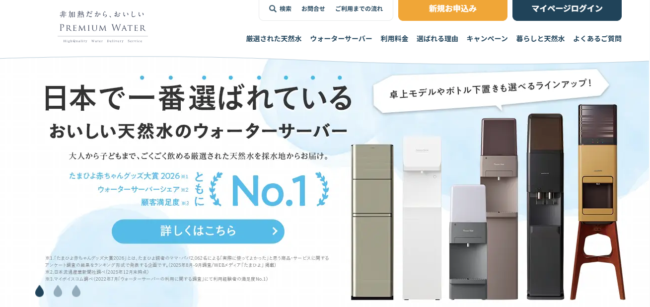 プレミアムウォーターは、国内でもトップクラスの利用者数を誇る人気ウォーターサーバーサービスです。全国各地の厳選された採水地から天然水を届けており、水の味や品質にこだわるユーザーから高い支持を集めています。