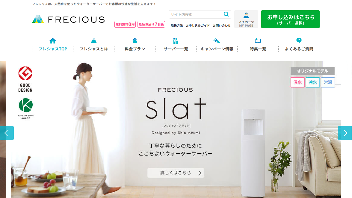 フレシャスは、デザイン性の高いウォーターサーバーとして人気のあるサービスです。おしゃれなサーバーラインナップが特徴で、インテリアとしても楽しめるウォーターサーバーとして多くのユーザーに支持されています。