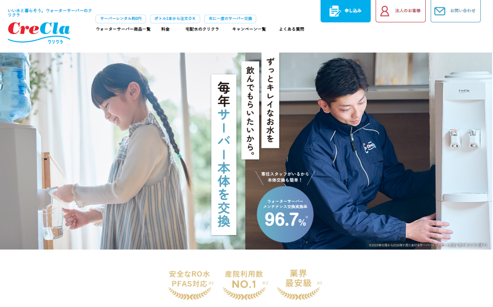 クリクラは宅配水サービスの中でも長い歴史を持つ老舗ブランドで、多くの家庭やオフィスで利用されているウォーターサーバーサービスです。安全性と品質管理に力を入れており、長年にわたり多くの利用者から信頼を集めています。