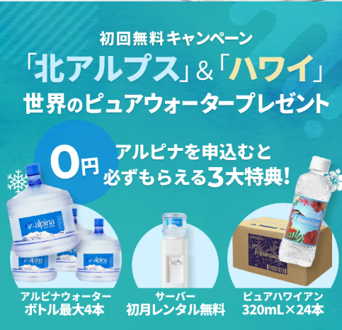 今回紹介したウォーターサーバーの中でも、特におすすめなのがランキング1位のアルピナウォーターです。